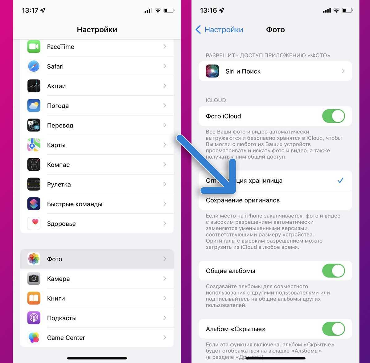 Фото на iPhone могут синхронизироваться двумя способами: оптимизация и хранение оригиналов. Оптимизация фотографий означает то, что файлы сохраняются в «размытом» качестве, но при появлении интернета снова загружаются, а в облаке сохраняется только оригинал. Это делается для того, чтобы в телефоне оставалась как можно больше места.