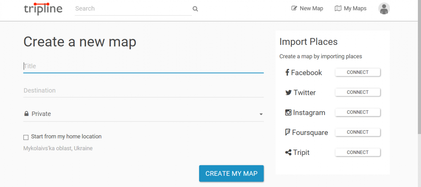 Справа указана возможность импортировать места из: Facebook, Twitter, Instagram, Foursquare & Tripit.