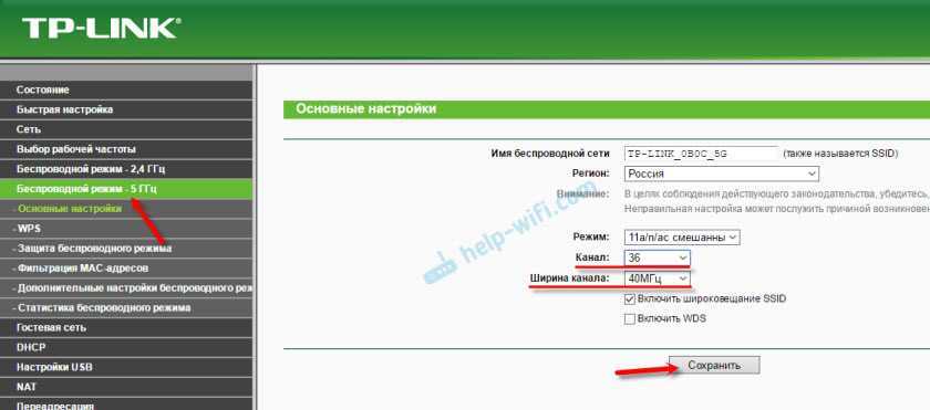Если вы уварены, что ваш адаптер, ноутбук, или мобильное устройство поддерживает сети на частоте 5 GHz, но не видит их, можно попробовать поэкспериментировать с настройками канала и ширины канала самой Wi-Fi сети. Сменить эти параметры можно в настройках маршрутизатора в разделе с настройками беспроводной сети. Попробуйте, например, поставить ширину канала 40 МГц, и какой-то статический канал из списка. Только не ставьте слишком высокий канал. Можете выставить 36-той. Или канал оставить на авто, а сменить только ширину канала. Я показал на примере роутера от TP-Link.