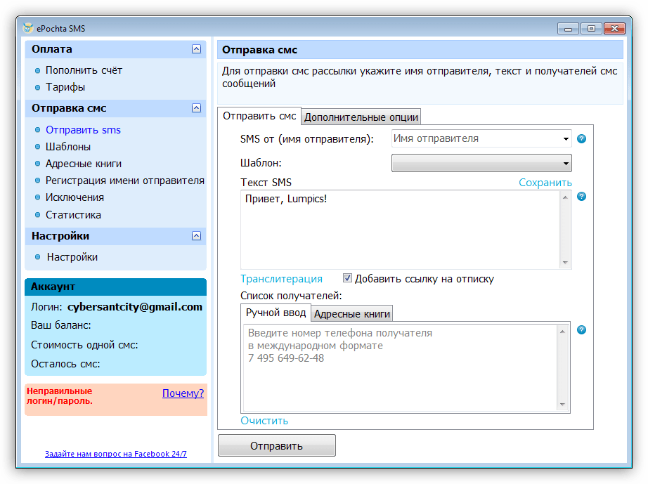 Программа еПочта СМС предназначена для массовой рассылки небольших сообщений на необходимые номера. Из всех представленных выше способов этот является наиболее затратным и непрактичным. Как минимум все до единой его функции являются платным. Каждое сообщение рассчитывается в зависимости от тарифного плана. В общем, данное ПО лучше использовать только в крайнем случае.