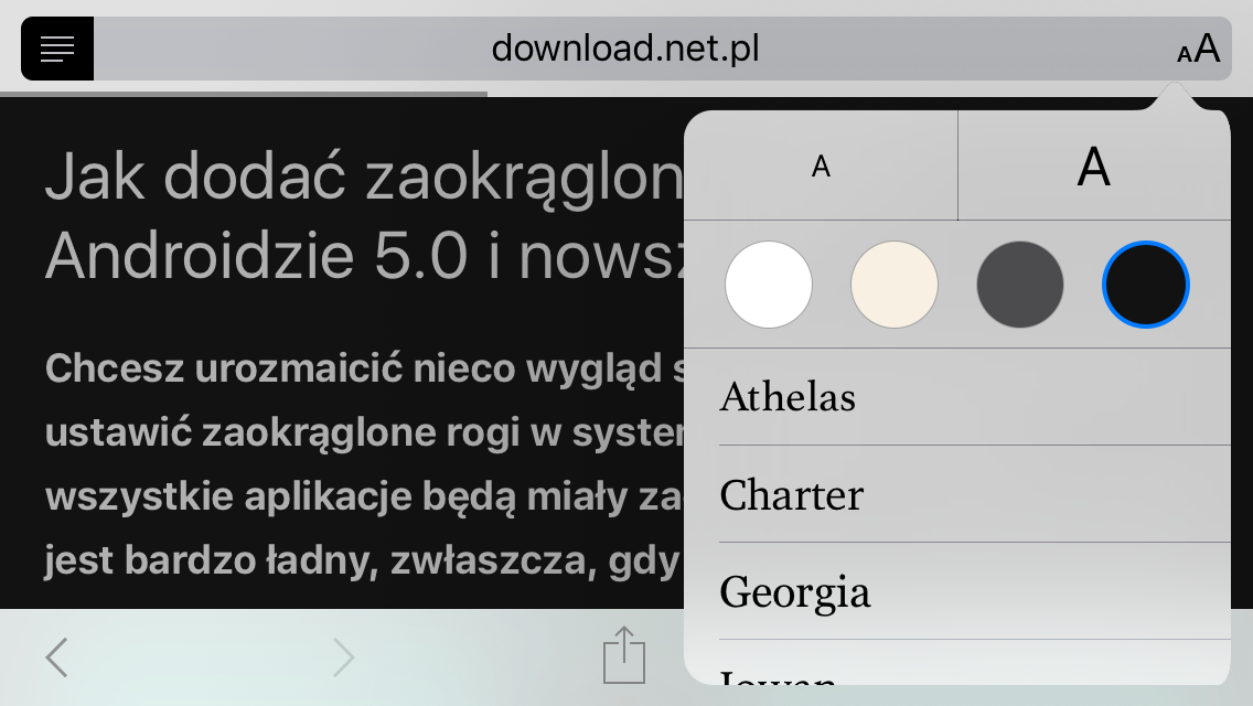 Как только мы это сделаем, и веб-сайт загрузится в режиме Reader, в правой части адресной строки Safari вы найдете небольшую иконку, на которой отображается ярлык настроек шрифта (Aa). Выбрав его, мы можем не только изменить размер шрифта и шрифт в Router, но и фон. Доступно несколько вариантов — помимо черного, также сепия и серый.