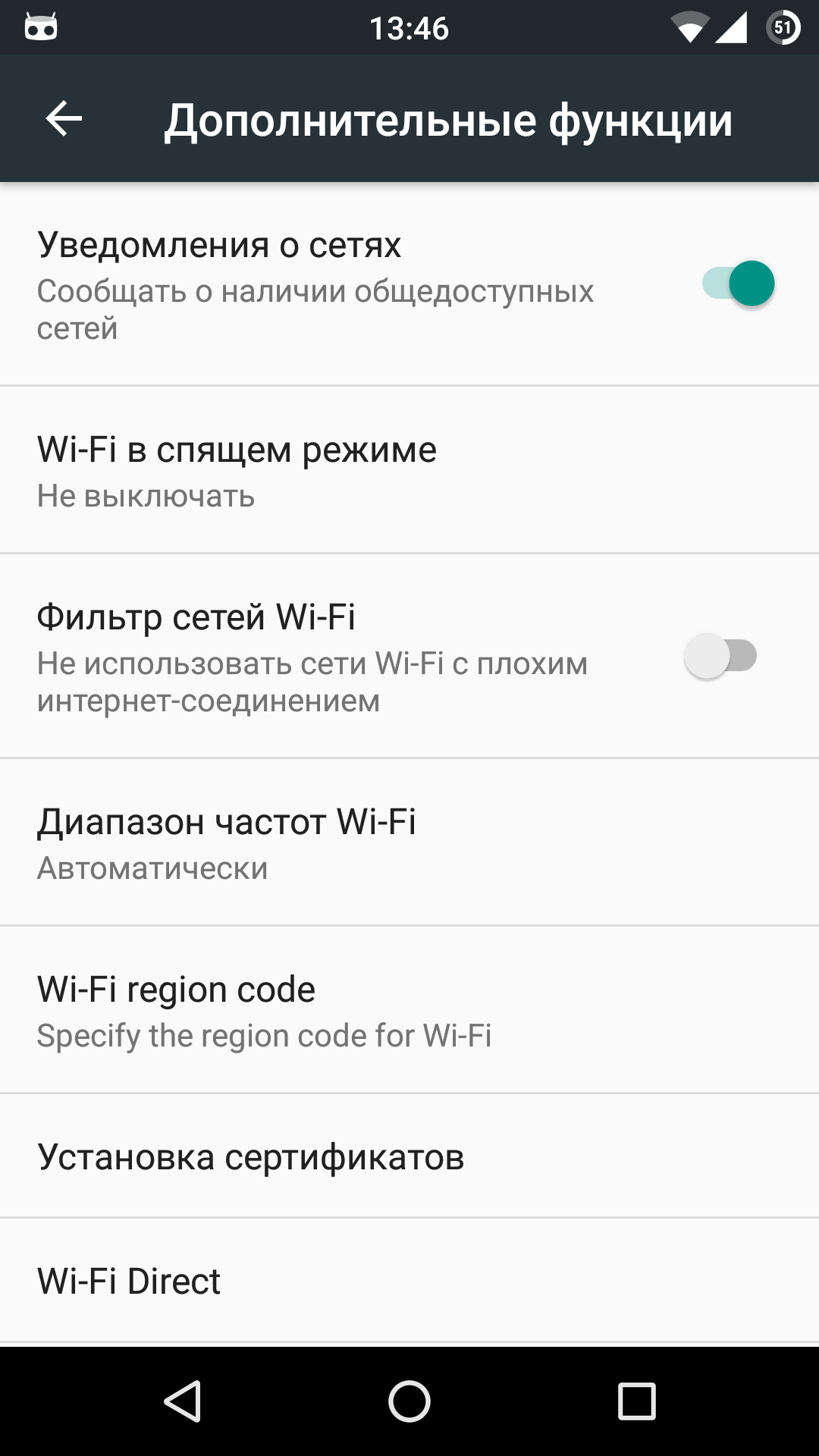 В Android есть совсем незаметный и неизвестный большинству пользователей раздел настроек с дополнительными опциями Wi-Fi. Чтобы до него добраться, необходимо перейти в «Настройки -> Wi-Fi», затем нажать клавишу меню и выбрать «Дополнительные функции». Здесь можно отключить уведомления об обнаруженных сетях, отключить Wi-Fi в спящем режиме (не рекомендую: работая в пассивном режиме, модуль Wi-Fi съедает меньше батареи, чем при включении/отключении), запретить использовать сети Wi-Fi с плохим сигналом и настроить Wi-Fi Direct (прямое сопряжение устройств без использования точки доступа).