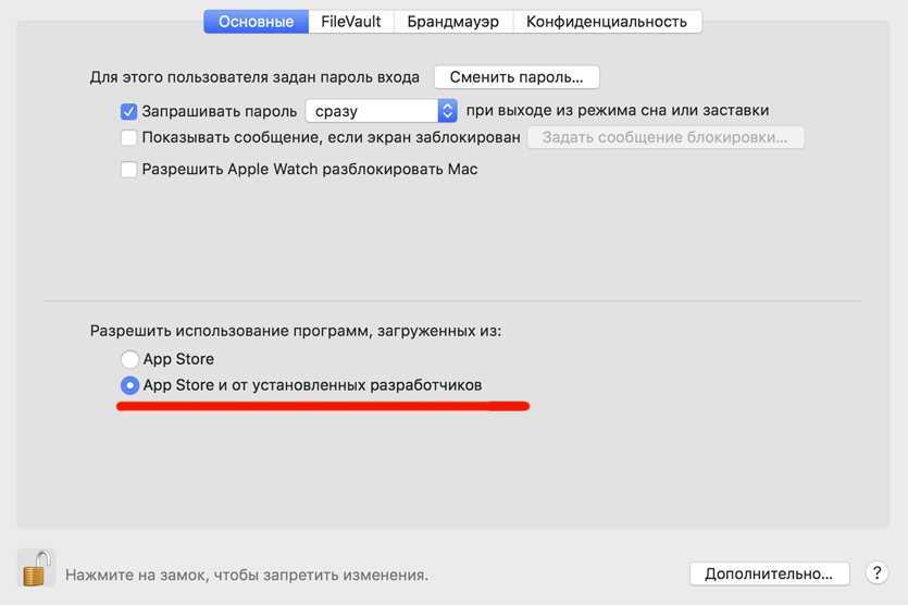 Чтобы разрешить эту функцию, нужно пройти в Настройки – Защита и безопасность и отметить чекбокс напротив «Разрешить использование программ, загруженных из App Store и от установленных разработчиков».