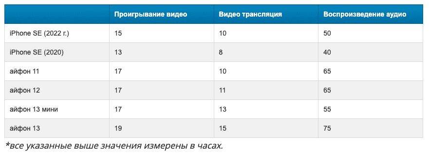 Официальные цифры Apple показывают, что новый iPhone SE работает 15 часов против 13 часов у SE (2020) для потоковой передачи видео. Для сравнения, iPhone 11 имеет аккумулятор, которого хватает на 17 часов непрерывного воспроизведения видео, то же самое с iPhone 13 mini, а более крупный iPhone 13 может работать до 19 часов.