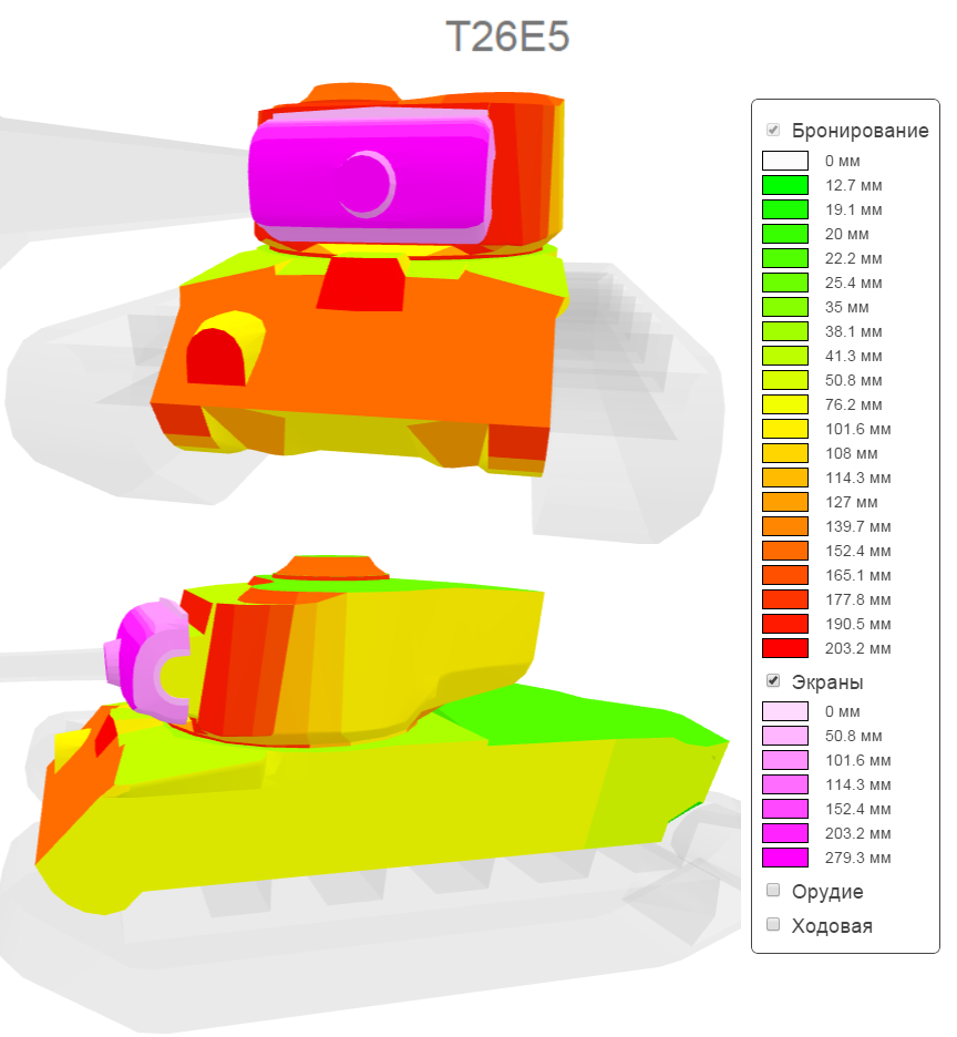 Борта с посредственным бронированием в 76 мм и отсутствующими экранами и наклонами не позволяют использовать танк для игры ромбом и от борта. Однако, не корпусом славятся американские машины. Премиум танк Т26Е5 обладает характерной для танков США крепкой башней, очень схожей с Першингом.