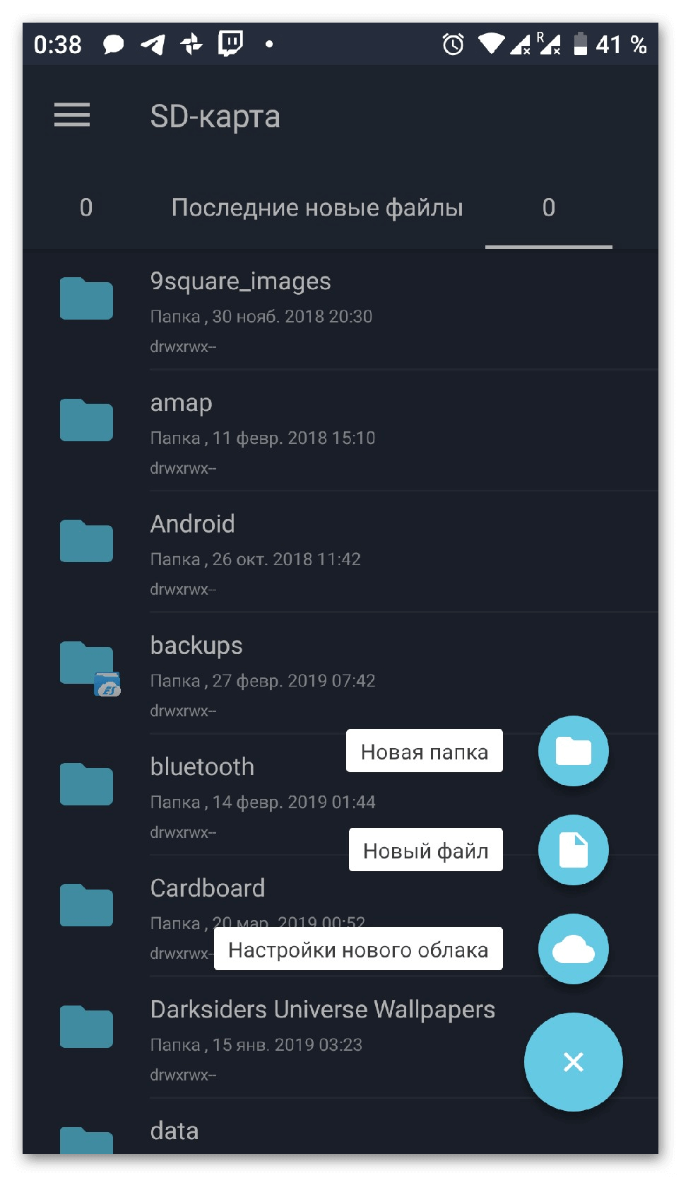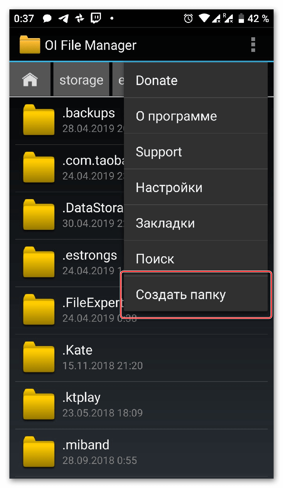 Приятный менеджер с сортировкой файлов по нескольким категориям в зависимости от формата. Нажимаем на синюю кнопку. Из контекстного меню выбираем «Новая папка» и присваиваем ей имя.