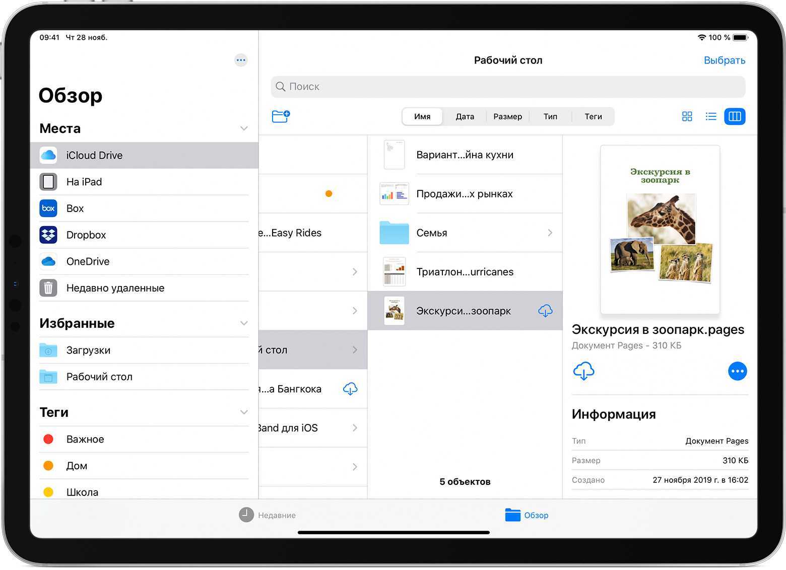 В приложении «Файлы» представлены файлы, которые хранятся как на используемом устройстве, так и в других облачных службах и приложениях, а также на iCloud Drive. Вы также можете работать с файлами ZIP.* Для доступа к файлам откройте приложение «Файлы» и выберите расположение нужного файла.