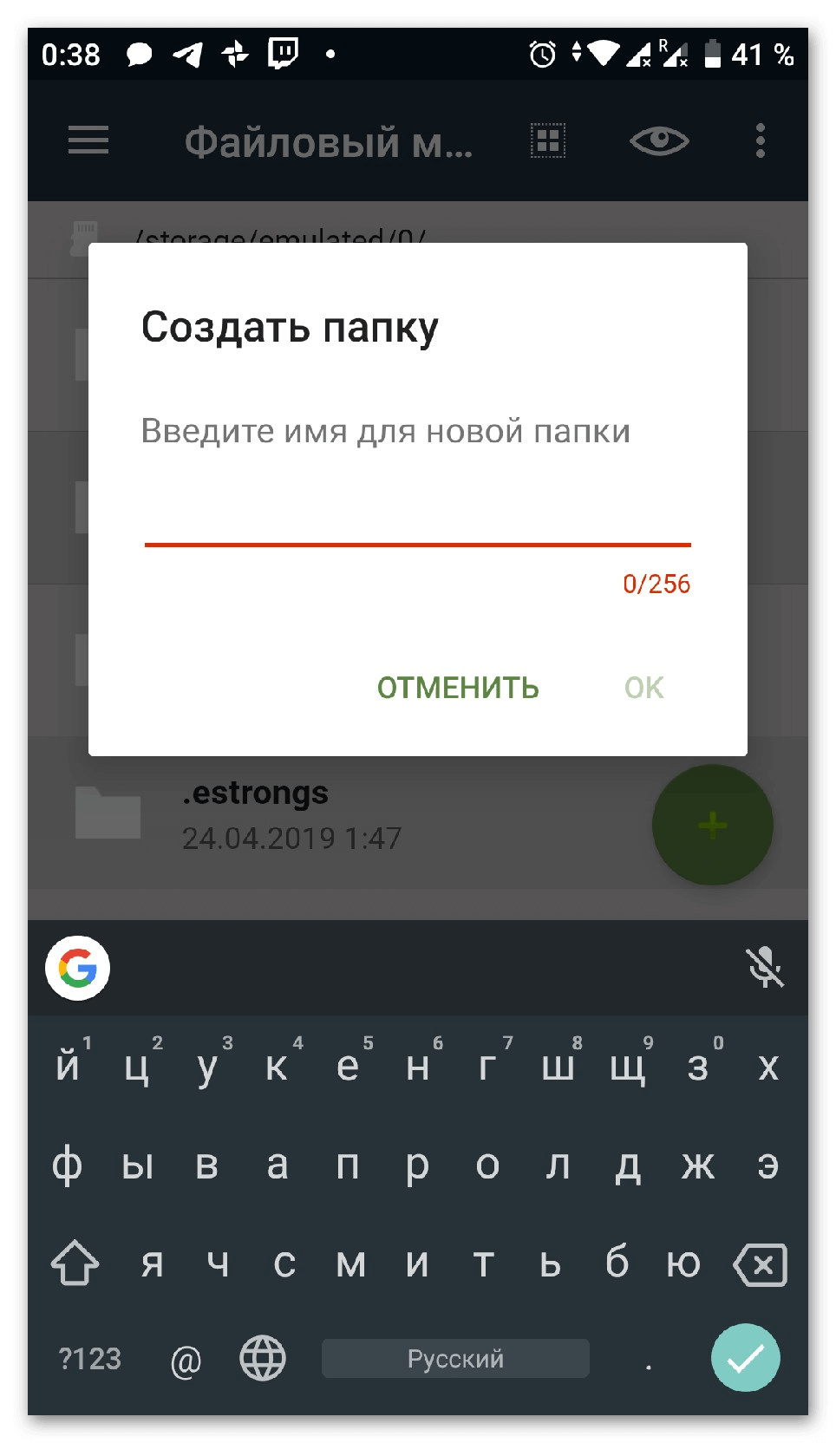 Нажимаем на пункт «Файловый менеджер». Появится окно со списком всех файлов на смартфоне. Кликаем на зелёную иконку с плюсом в правой нижней части экрана. Вводим название для новой папки.