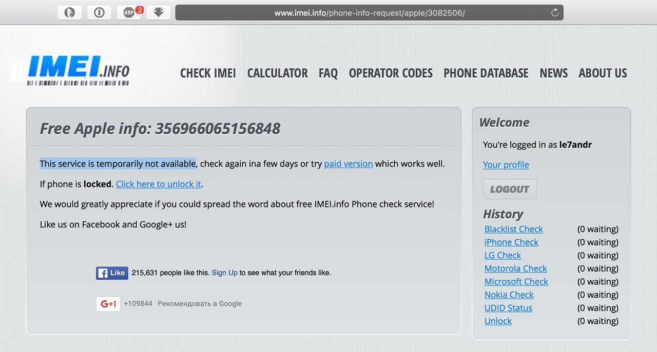 Существующие бесплатные сервисы по проверке iPhone по IMEI перестали выдавать информацию о статусе блокировки устройства. На всех известных мне сайтах бесплатная проверка либо недоступна, либо выдает результат: «Unknown» (Неизвестно), например, здесь.