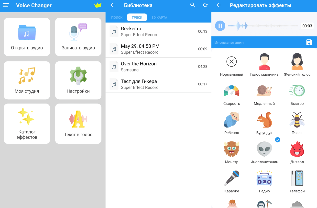 Эффектов для изменения звука с микрофона достаточно много: доступен голос девушки, мужчины, робота, накладывание шумов (пещера, замок и пр.) и т.д. Кстати, в приложение реализована возможность эмуляции разговорной речи.