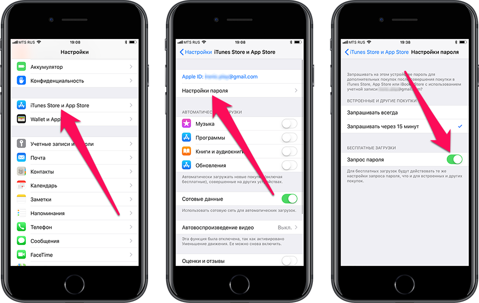 Перейти в меню «Настройки» → «iTunes Store и App Store» → «Настройки пароля» и поставить флажок на параметре «Запрос пароля».