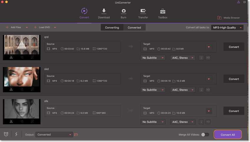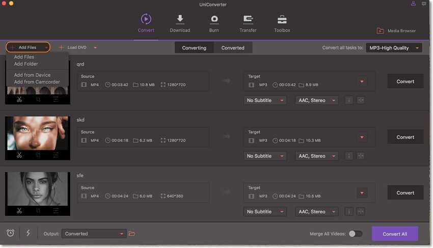 Wondershare UniConverter (изначально Wondershare Video Converter Ultimate) возглавляет этот список как лучший MP3-конвертер для Mac. Он быстро и эффективно конвертирует MP3 в многочисленные форматы файлов для Windows, устройств Apple, Blackberry, Zune, Android, игровых приставок, конвертера YouTube в MP3 и т.д. Его главные достоинства — это высокая скорость конвертации и экономия системных ресурсов. Он также имеет интуитивно понятный интерфейс, он прост в использовании и позволяет выполнять пакетную конвертацию MP3.
