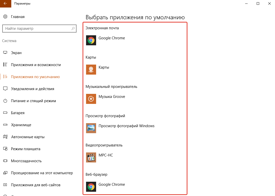 В списке будут отображено, какая из программ что именно открывает, например, какая программа используется в качестве видео проигрывателя, какая является веб-браузером и пр.
