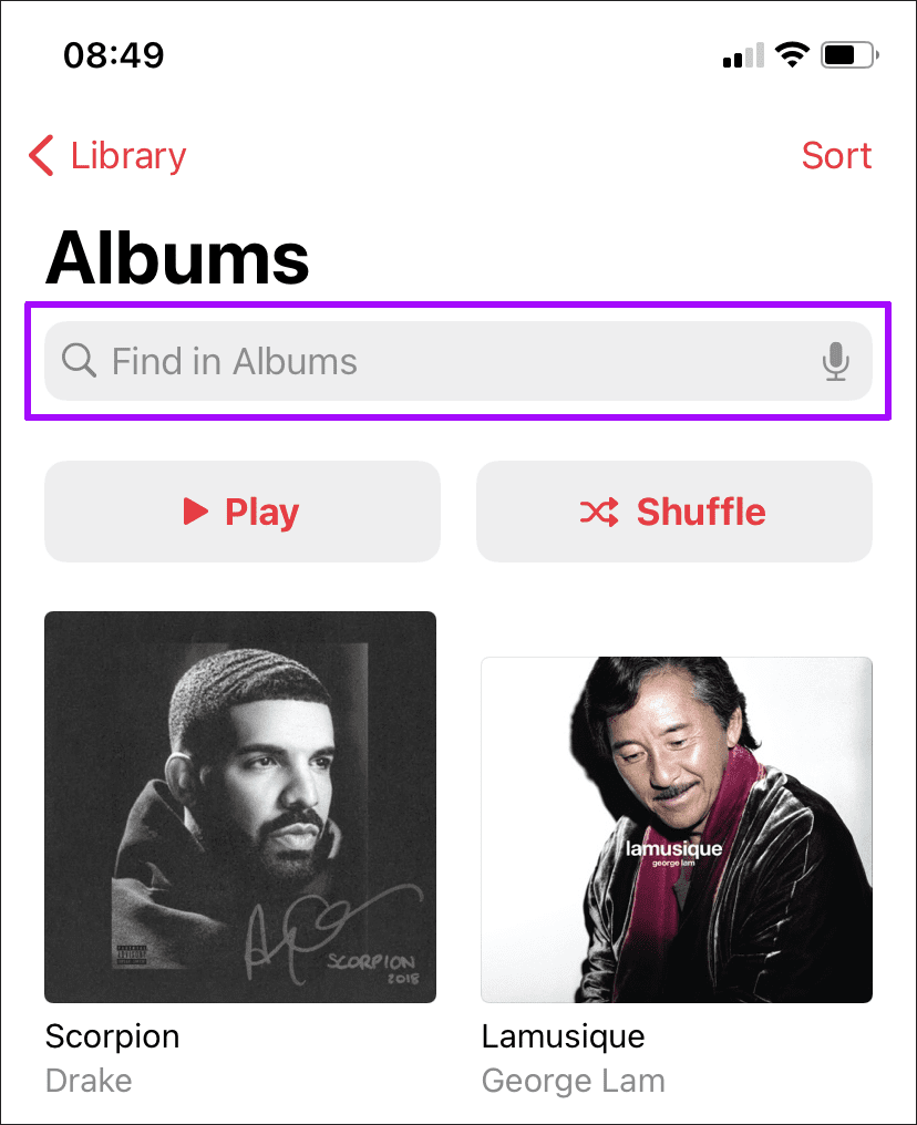 Начните с нажатия на любую из категорий в библиотеке — «Альбомы», «Исполнители», «Плейлисты» и т. д. Затем проведите пальцем вниз, чтобы открыть панель поиска.