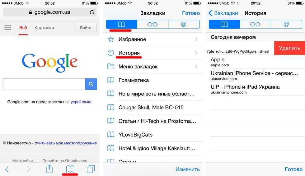 Как посмотреть список посещенных страниц? Прежде всего, нужно зайти в браузер «Safari» и тапнуть по иконке книжки на его нижней панели. Затем следует перейти во вкладку «История», где хранятся сайты, которые недавно открывались на текущем аккаунте. Все, что нужно — просмотреть список и удалить нежелательные страницы, сделав свайп по ним справа налево. Таким же способом можно удалять сайты из списка «для чтения», которые станут недоступными сразу на всех устройствах, привязанных к данному аккаунту.