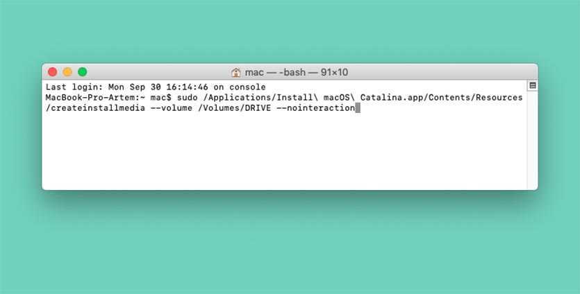 sudo /Applications/Install macOS Catalina.app/Contents/Resources/createinstallmedia —volume /Volumes/DRIVE —nointeraction
