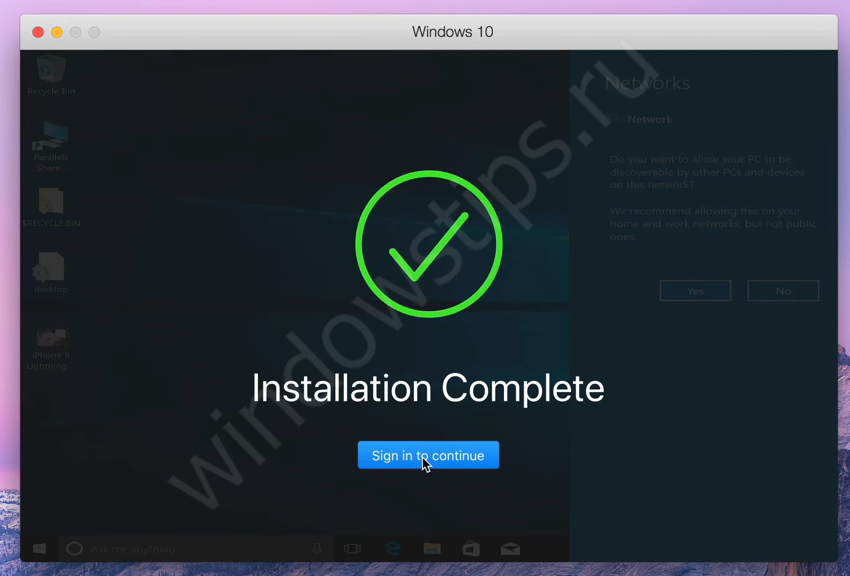 Закройте окно конфигурации, затем нажмите «Продолжить», чтобы завершить установку Windows 10. После завершения установки вы можете запускать Windows 10 через Parallels Desktop 16 для Mac.