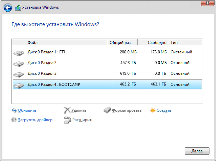 - В списке с доступными разделами для установки выберите тот, который был создан программой Boot Camp. Он носит соответствующее наименование. Нажмите на «Далее», чтобы начать процесс установки Windows 10.