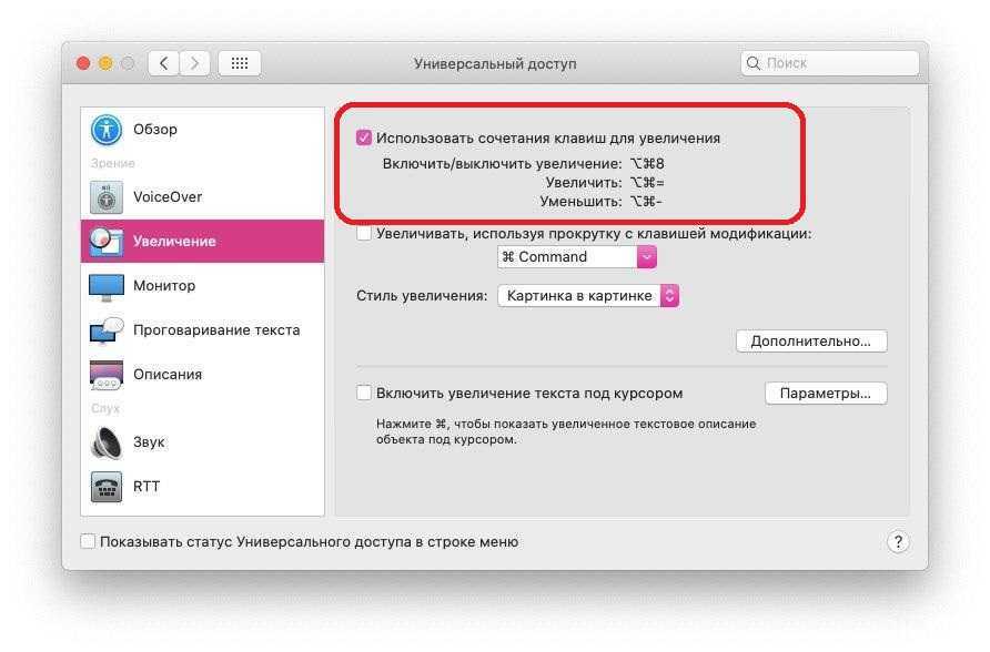 3) Справа поставьте галочку рядом с Использовать сочетания клавиш для увеличения. Запомните сочетания клавиш, которые будете использовать.