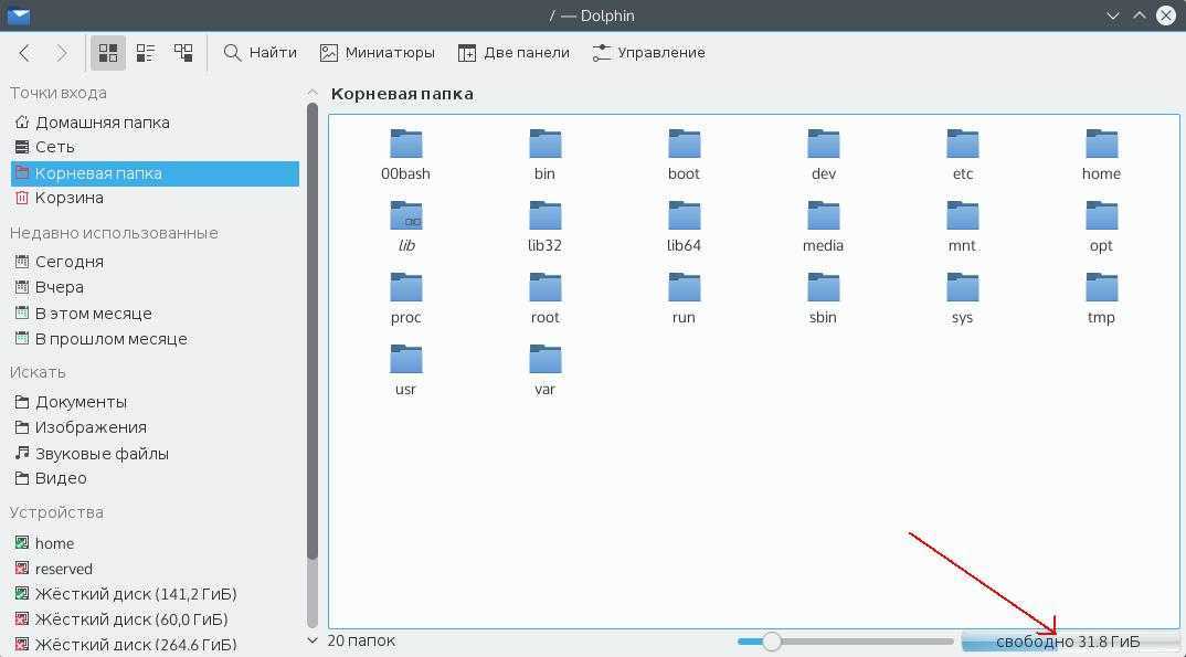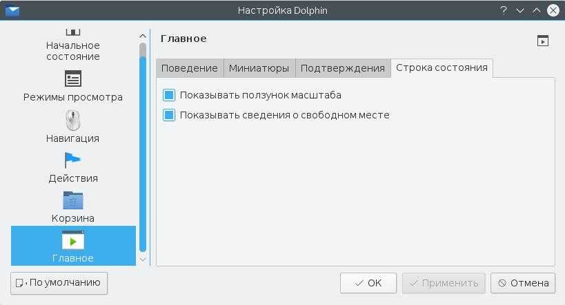 Также Dolphin, файловый менеджер KDE, позволяет отображать свободное пространство на текущем разделе в строке состояния. Для этого откройте Настроить Dolphin, Главное, Строка состояния и включите галочку Показывать сведения о свободном месте: