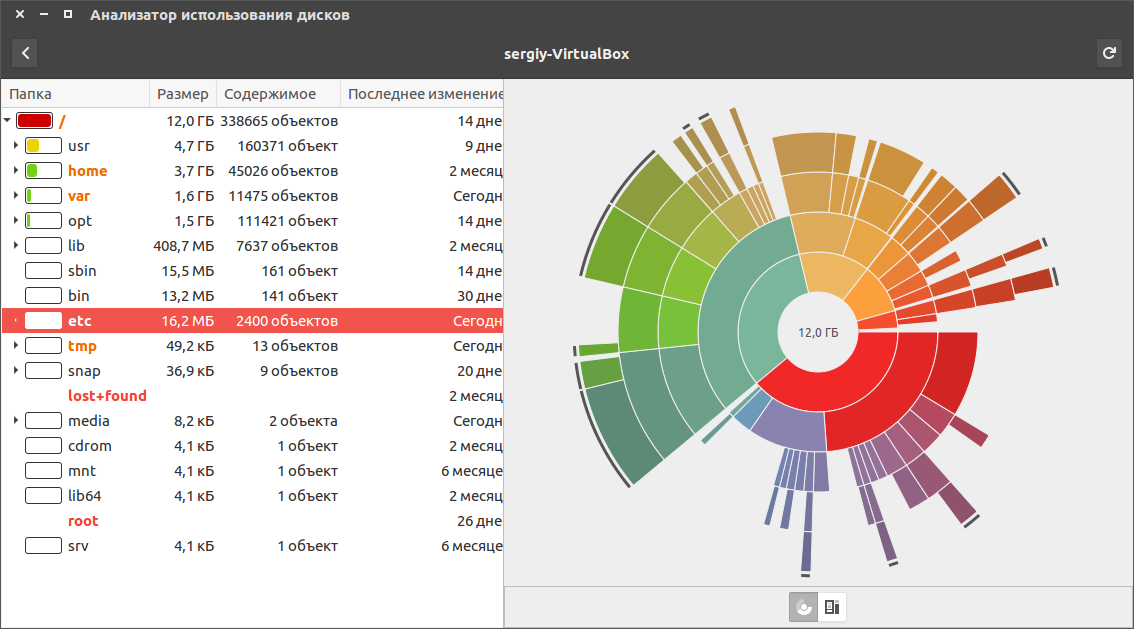 Еще один способ выполнить просмотр свободного места на диске linux, это воспользоваться утилитой baobab. Это стандартный дисковый анализатор в Ubuntu, утилита показывает не только занятое и свободное место, но и круговую диаграмму размера папок и файлов на диске, что позволяет очень быстро понять куда же делось место: