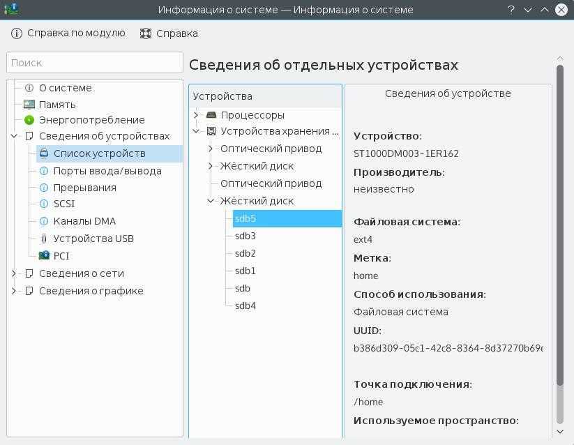Здесь отображены все подключенные разделы, а также их размер и количество доступного пространства.