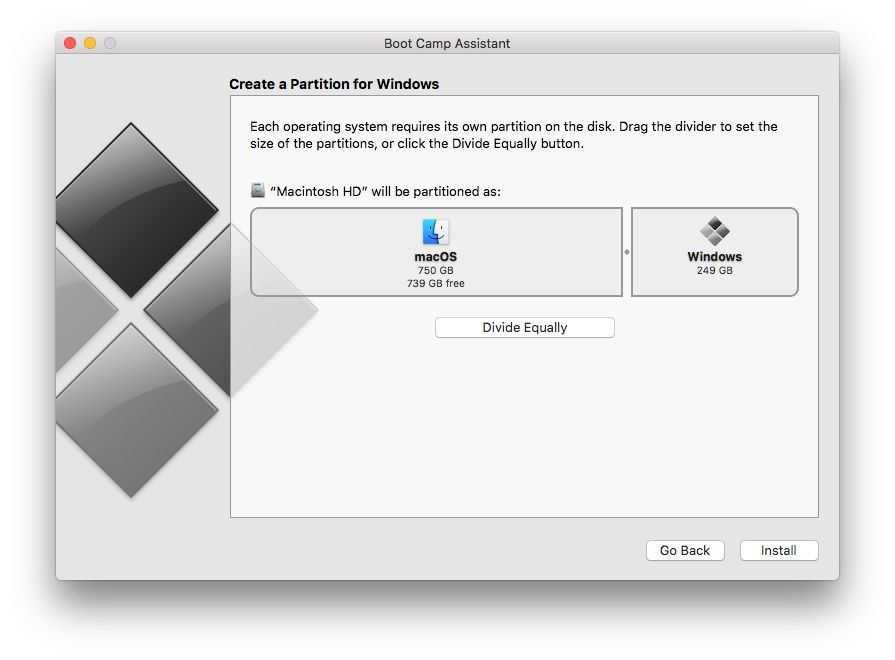 По умолчанию Boot Camp Assistant предлагает создать небольшой раздел Windows размером всего 32 ГБ, но вы можете использовать ползунок, чтобы настроить размер двух разделов по мере необходимости. Также есть кнопка, которая просто разделит диск на два раздела одинакового размера.