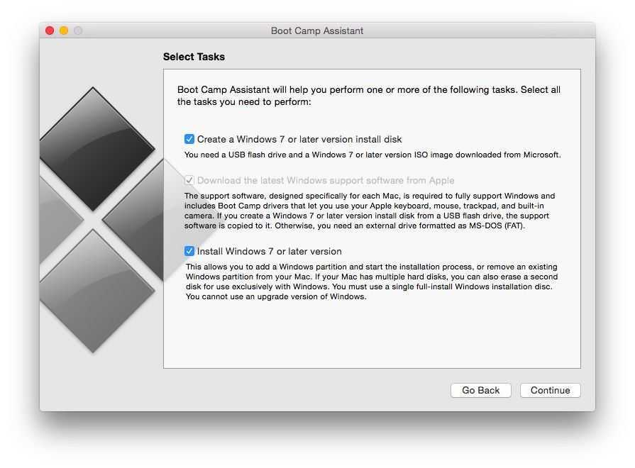 Когда вы запускаете Boot Camp Assistant в первый раз, он предложит вам несколько вариантов. Первый вариант — просто подтвердить, что вы хотите «Создать установочный диск Windows 7 или более поздней версии». Это скопирует ваш файл Windows ISO на карту памяти USB, чтобы вы могли установить Windows.