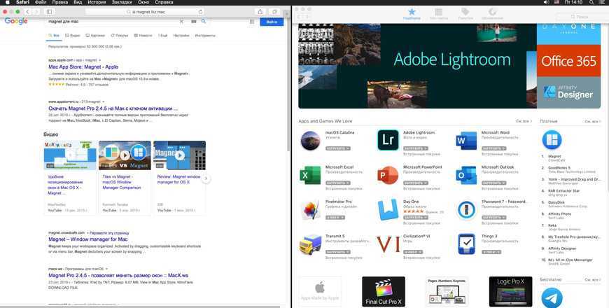 Чтобы сделать разделенный экран (Split View) зажмите зеленую кнопку (развернуть окно) и переместите окно вправо или влево — оно займет половину экрана. Далее открываем второе приложение и помещаем его на второй части экрана.