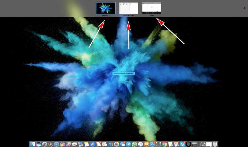 Spaces — это по сути список запущенных рабочих пространств на компьютере. Чтобы вызвать доступные spaces, сделайте жест четырьмя пальцами вверх по трекпаду. Запустится сервис Mission Control и вверху появится список нескольких открытых «рабочих столов».