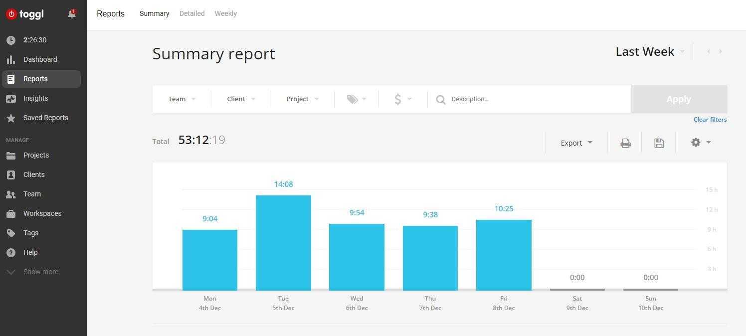 Toggl — кроссплатформенный тайм-трекер. Есть возможность работы в команде и шеринга для клиентов. Можно менять workplaces — чтобы отдельно считать время, затраченное на несколько сайд-проектов. Эта функция также полезна для тех сотрудников, которые работают part-time. Автоматически строит аккуратные и наглядные отчеты.