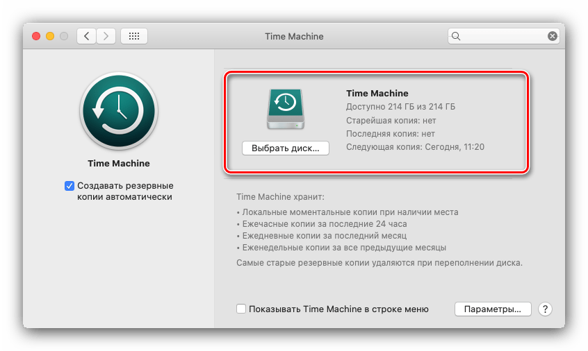 Time Machine в окне системных настройках