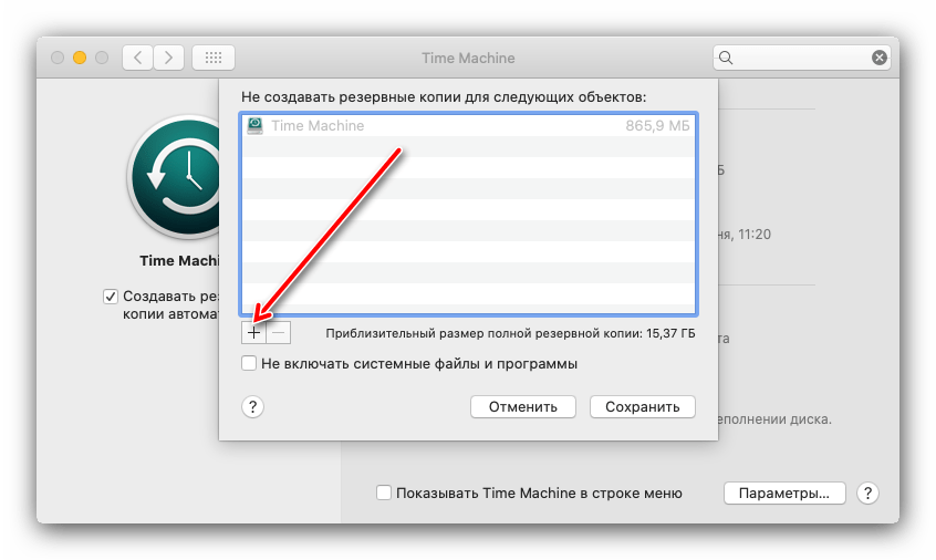 Обратите внимание на список с названием «Не создавать резервные копии для следующих объектов». Для добавления папки в исключения кликните по кнопке «+».