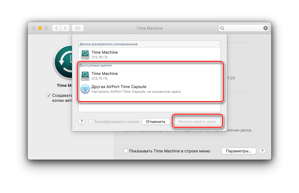 Выбор диска для Time Machine