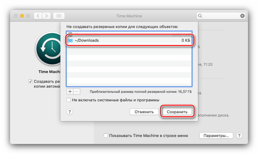 Файлы в папке из списка исключений больше не будут копироваться на диск Time Machine.
