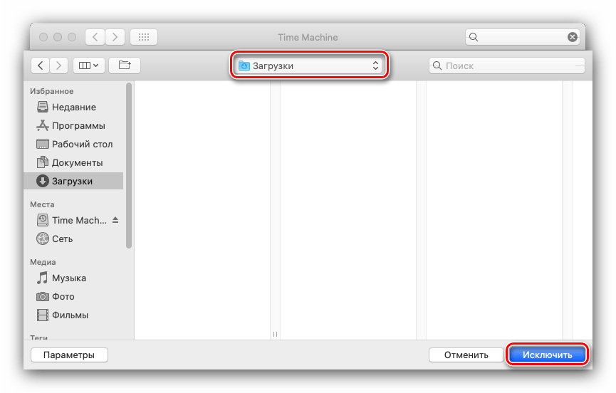 Далее с помощью Finder выберите директорию, которую желаете исключить – например, «Загрузки».