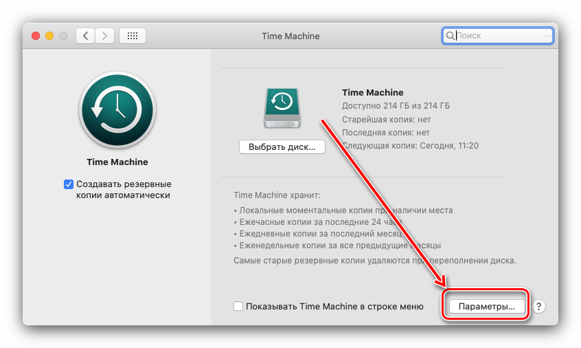 - Для второго метода откройте менеджер Time Machine и кликните по кнопке «Параметры».